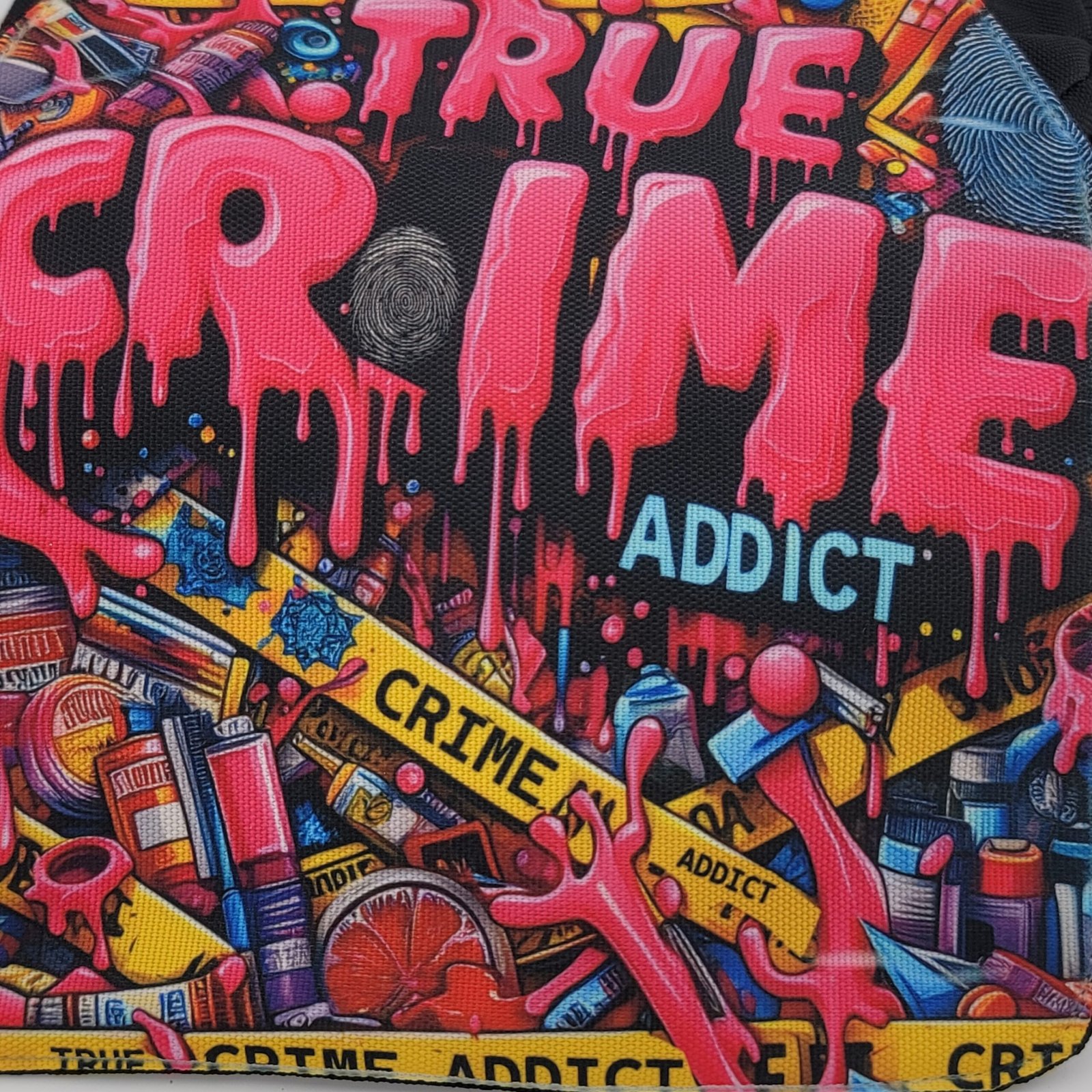 The double zipper design offers ample storage for your essentials, keeping your belongings safe and organized – whether you’re stashing notes, makeup, or evidence (not that you’d need to, of course). Made with sturdy materials, this bag features eye-catching graphics inspired by the thrilling world of crime stories. Its quirky, bold design is sure to stand out, making it a conversation starter wherever you go.